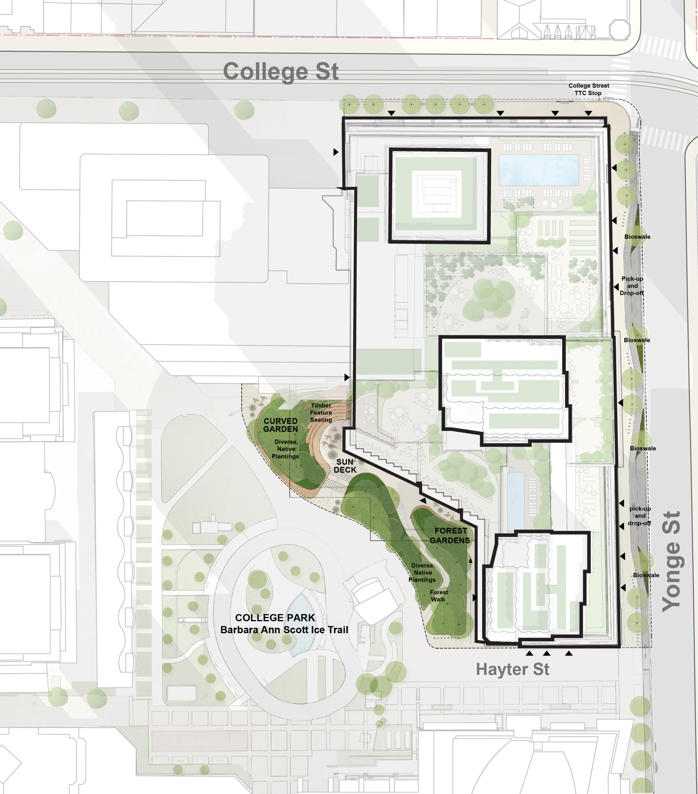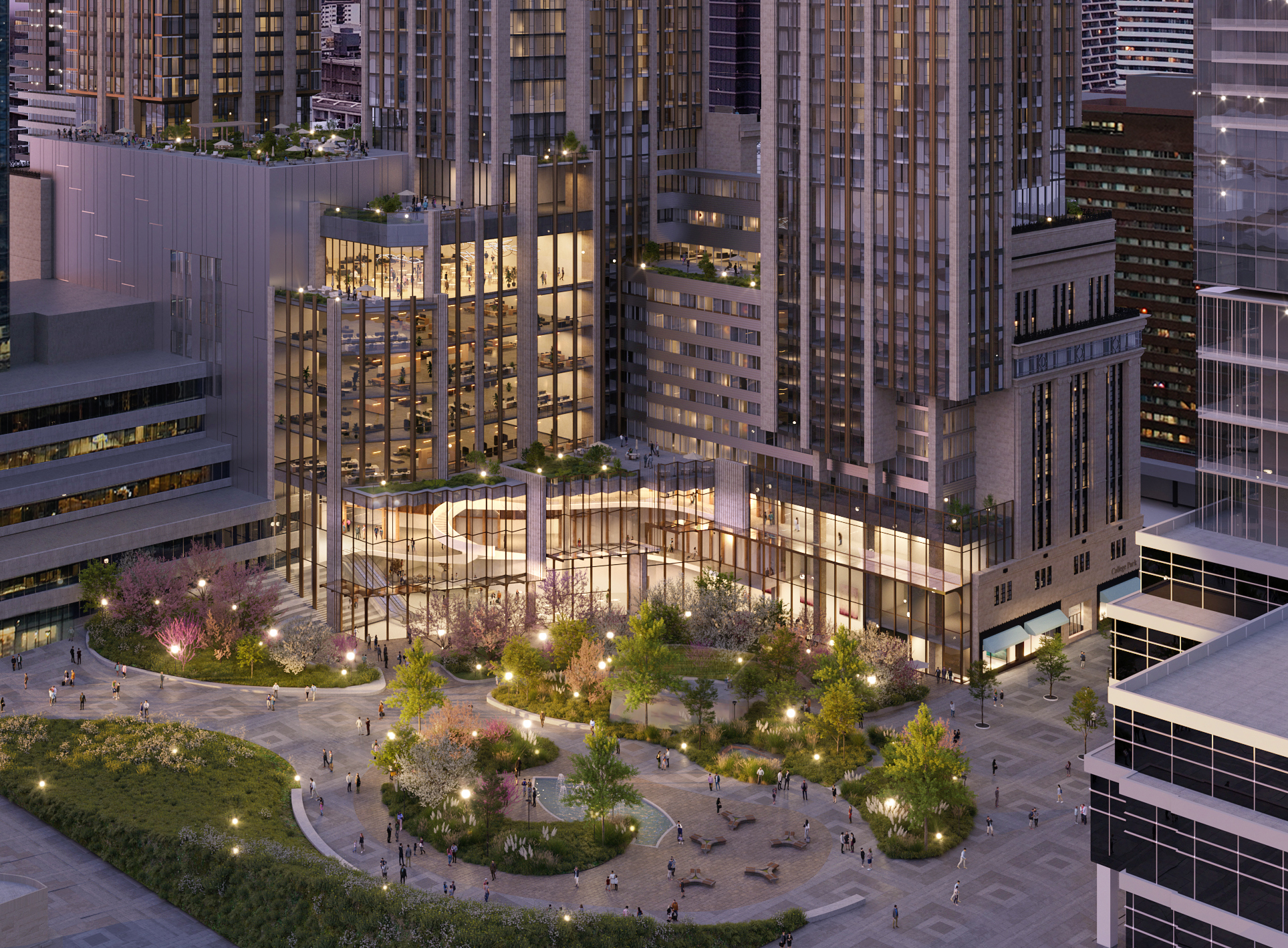 The Proposal introduces new landscaped open spaces that will expand and improve the existing College Park parkland, integrating flexible indoor programming and public realm improvements. This is intended to create a seamless and continuous public space, enhancing openness, accessibility, and civic life across this key Downtown block.