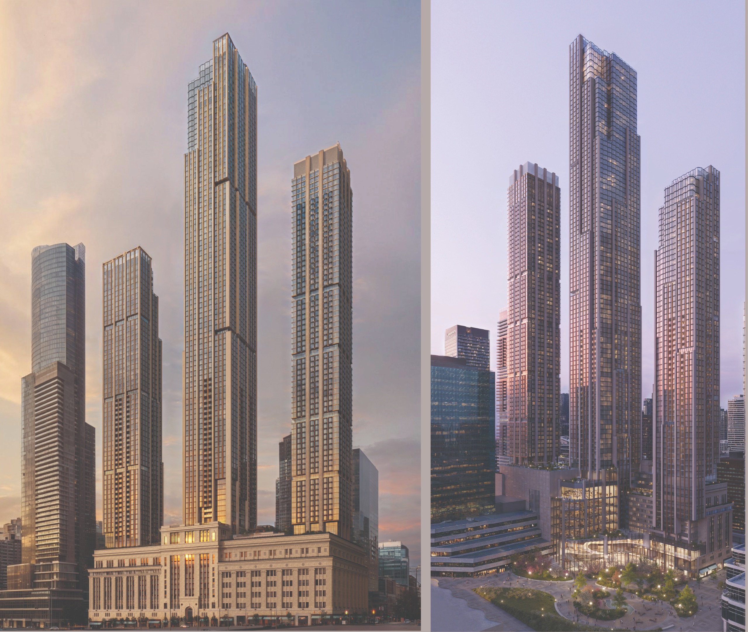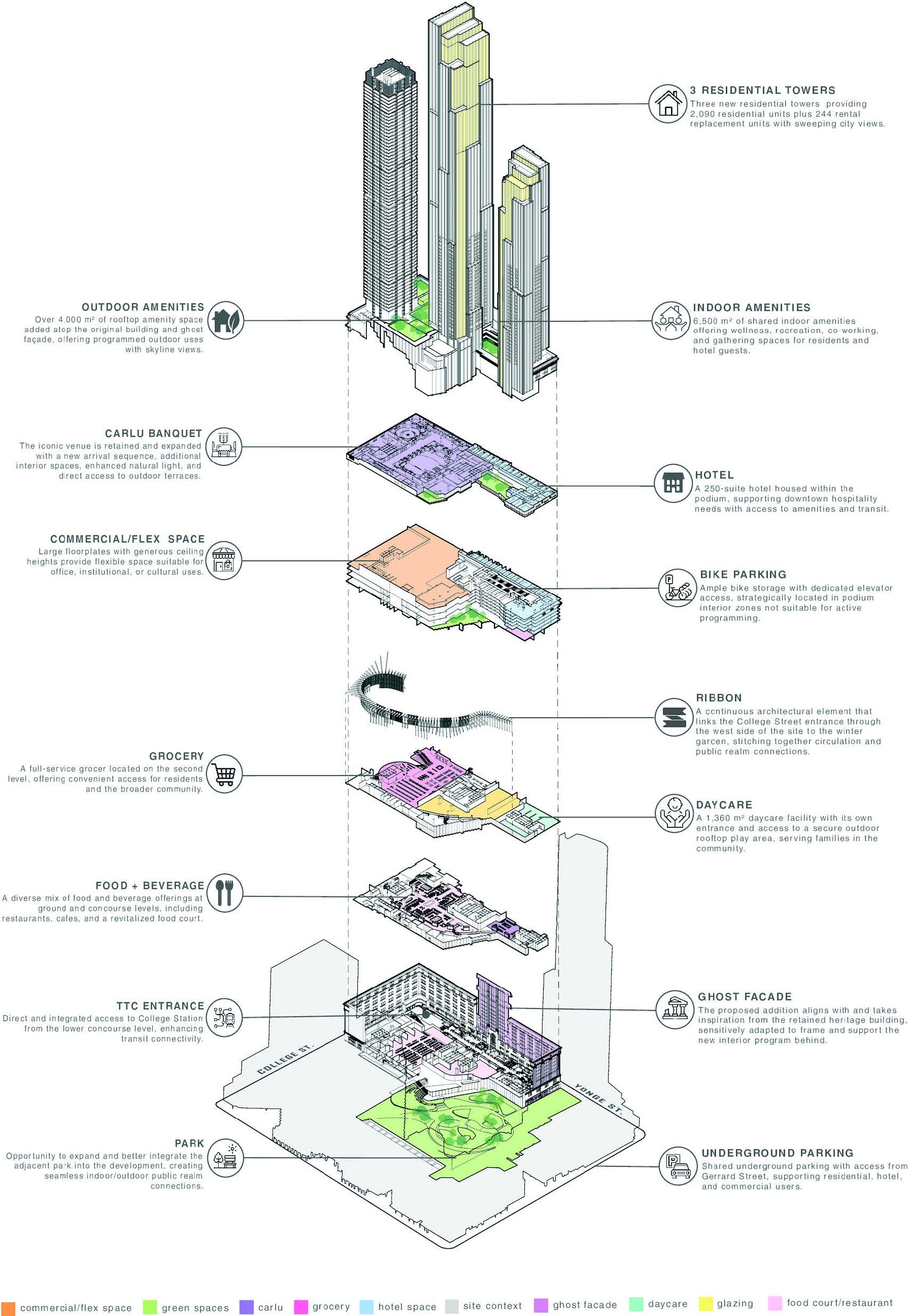 The Proposal vertically integrates a mix of residential, cultural, and commercial uses, complemented by a daycare and boutique hotel within the existing heritage base, a new seven-storey podium extension, and three contemporary residential towers, helping create an amenity-rich, transit-accessible block in the heart of downtown Toronto.