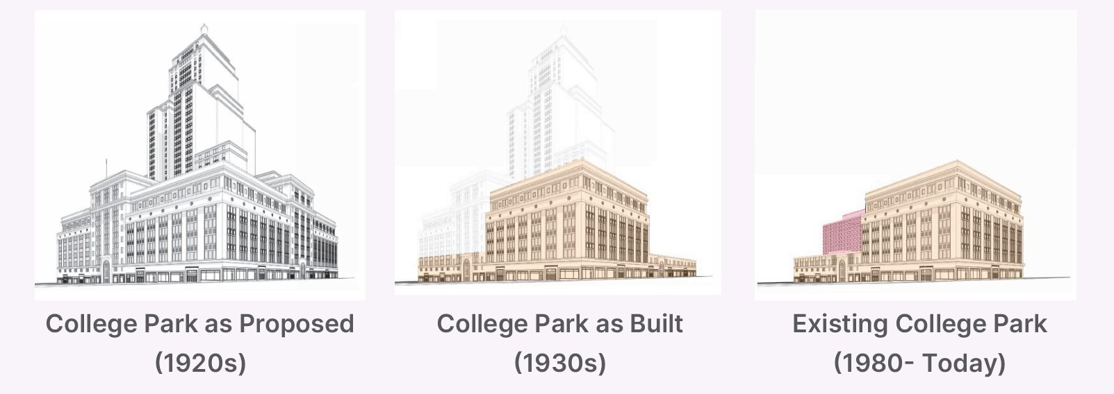 Evolution of College Park from its initial proposal in 1928 to today.
